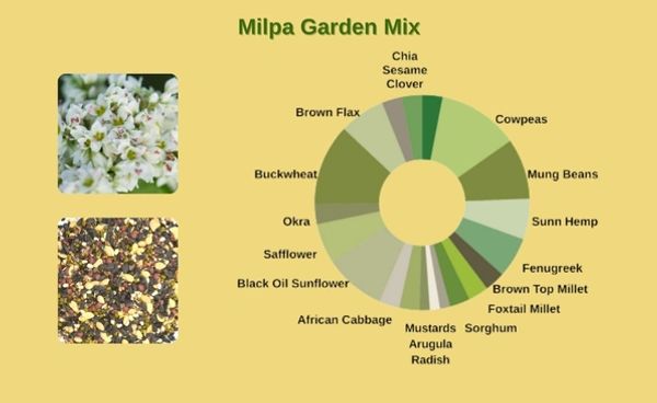 Tavera Green Beans, ND Twilight Black Beans, 4010 Spring Forage Pea, Iron and clay cowpeas, Mung Beans, Balady Berseem Clover, Mancan Buckwheat, Okra, Black Oil Sunflower, Russian Mammoth Sunflower, Phacelia, Flax, Purple Top Turnip, Radish - Pink celebration, Radish - crimson giant, Nitro Radish, Collards, Florida Broadleaf Mustard, Arugula, Early King Pumpkin, Squash - Waltham butternut, Watermelon Blend, Squash Blend, Melon Blend, Cucumber Blend,, Showy Flower Blend, Elevated Fungi, Rhizobac Extend Milpa seed ingredients are subject to change without notice based on seed availability.