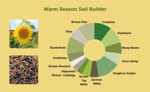 Cowpeas, Non-GMO Soybeans, Mung Beans, Sunn Hemp, PPS Sorghum Sudan, German Millet, Brown Top Millet, African Cabbage, Rapeseed, Brown Mustard, Sunflower, Buckwheat, Okra, Flax, RhizoBac X-Tend, and Elevate'd Fungi Inoculant